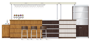 Пристенный модуль служит для экспонирования дорогого алкоголя. Впрочем, барная стойка по Вашему эскизу предполагает врезку необходимого барного оборудования (льдогенератор, холодильный шкаф для бара) в нижнюю часть пристенного модуля. Стоит учитывать, что на эту часть барной стойки направлен взгляд посетителей (за счет специальной подсветки и «привлекательной» продукции), поэтому дизайн пристенного модуля разрабатывается тщательно и может заказываться отдельно от других элементов.