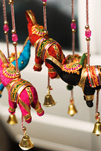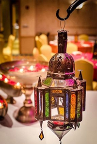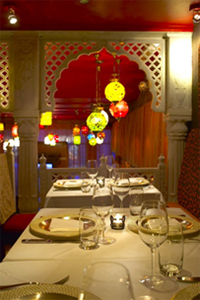 Интерьер ресторанов и кафе в индийском стиле немыслим без декоративных элементов. Стены украшают крупные зеркала в массивных рамах, ароматические свечи, шкатулки и коробочки, а также статуэтки персонажей индийской мифологии, фигуры слонов, коров, змей и крокодилов. Аксессуары размещают во встроенных нишах, на полках и столах. Дополняют интерьер кальяны, светильники из стекла, вазы, тарелки и чаши с оригинальной росписью.