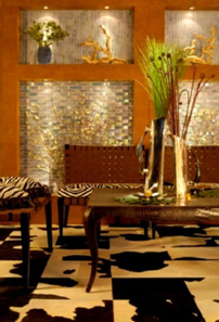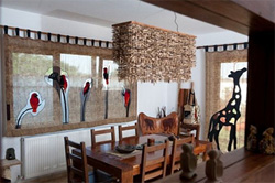 Начнем с первых. Самая благодатная почва для использования обсуждаемых элементов — африканские мотивы. Савана, нынешняя цитадель дикой природы, предлагает самые немыслимые по яркости краски и сколь угодно великое количество животных. Здесь стоит оговориться, что необязательно использовать образ конкретного представителя фауны. То же оформление барной стойки в кафе может быть выполнено при помощи отличительных черт животного. Кому неизвестны полоски зебры, пятна жирафа или фактура крокодильей кожи? Соответствующее изображение можно использовать очень эффектно не только на баре, но и в остальных элементах интерьера. Небезызвестная московская сеть кафе успешно использует черно-белую корову, например. Впрочем, с Африкой стоит быть аккуратным. Это довольно агрессивный, хищный интерьер. Законы жанра таковы, что в заведении стиля «сафари» анимализм повсюду. Не напугайте посетителя излишней пестротой красок.