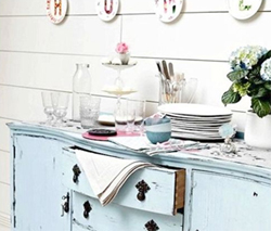 Если Вы хотите использовать шебби-шик в Вашем кафе или кофейне, добавьте несколько стильных ноток из прошлого: аксессуары и предметы мебели в винтажном стиле. Столы, диваны, кресла и стулья светлых пастельных тонов, слегка затертые, с трещинками, следами потрескавшейся краски. Пусть создается ощущение, что мебель служит уже несколько десятилетий, а то и сотню лет.