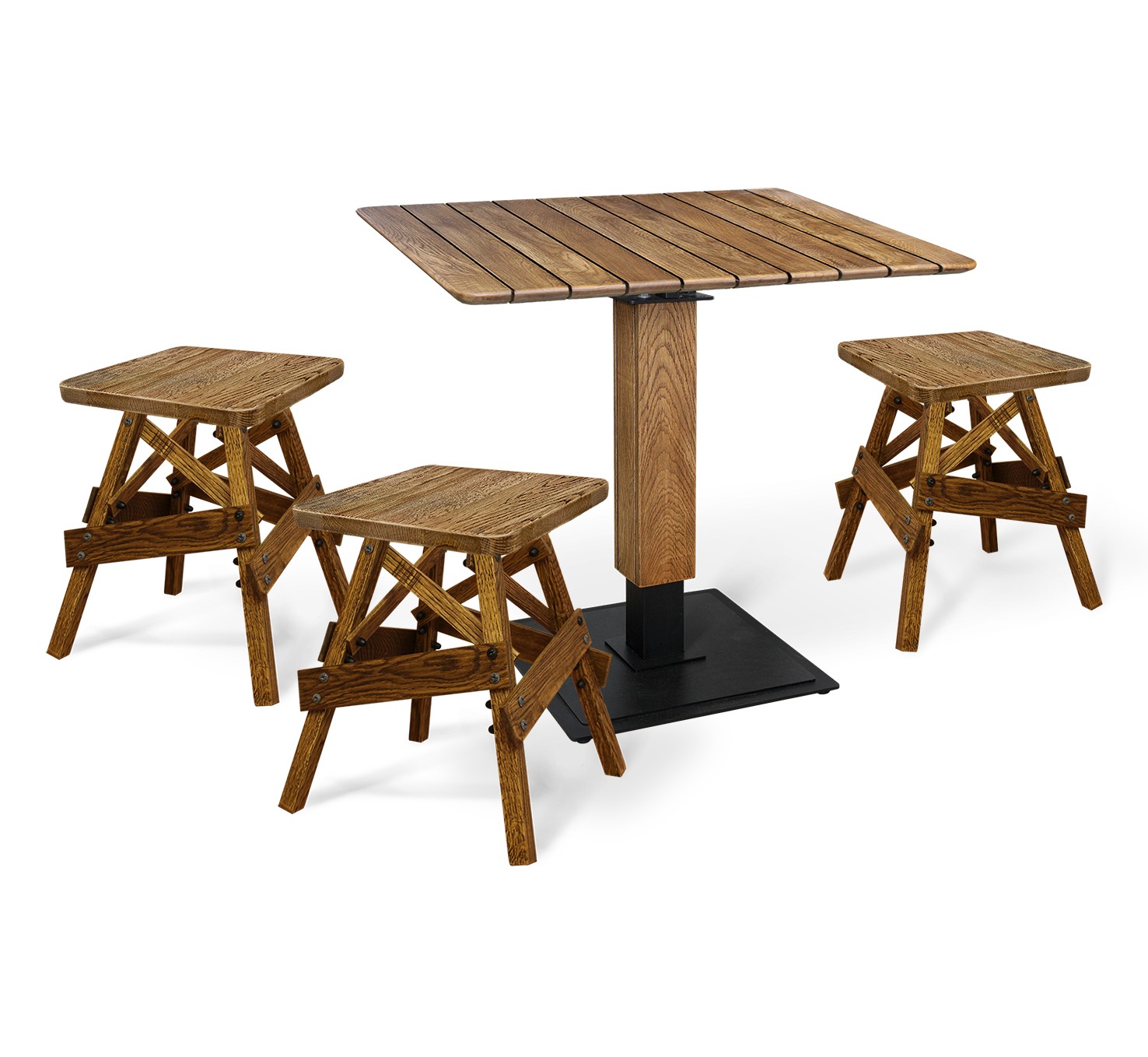- Основание выполнено из металла и отдекорированно пластинами из натурального "брашированного" дуба (эффект искусственного старения). Жесткость и прочность конструкции обеспечивается массивной металлической трубой из которой выполнена стойка. Усиленная крестовина из металла под столешницу.