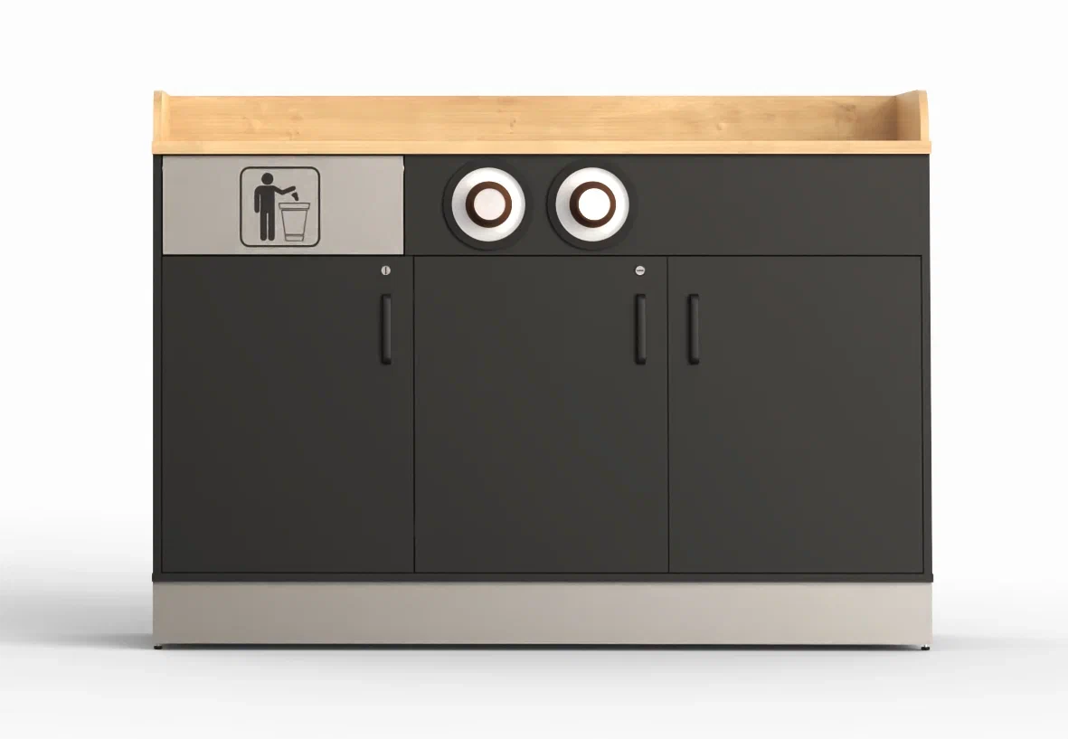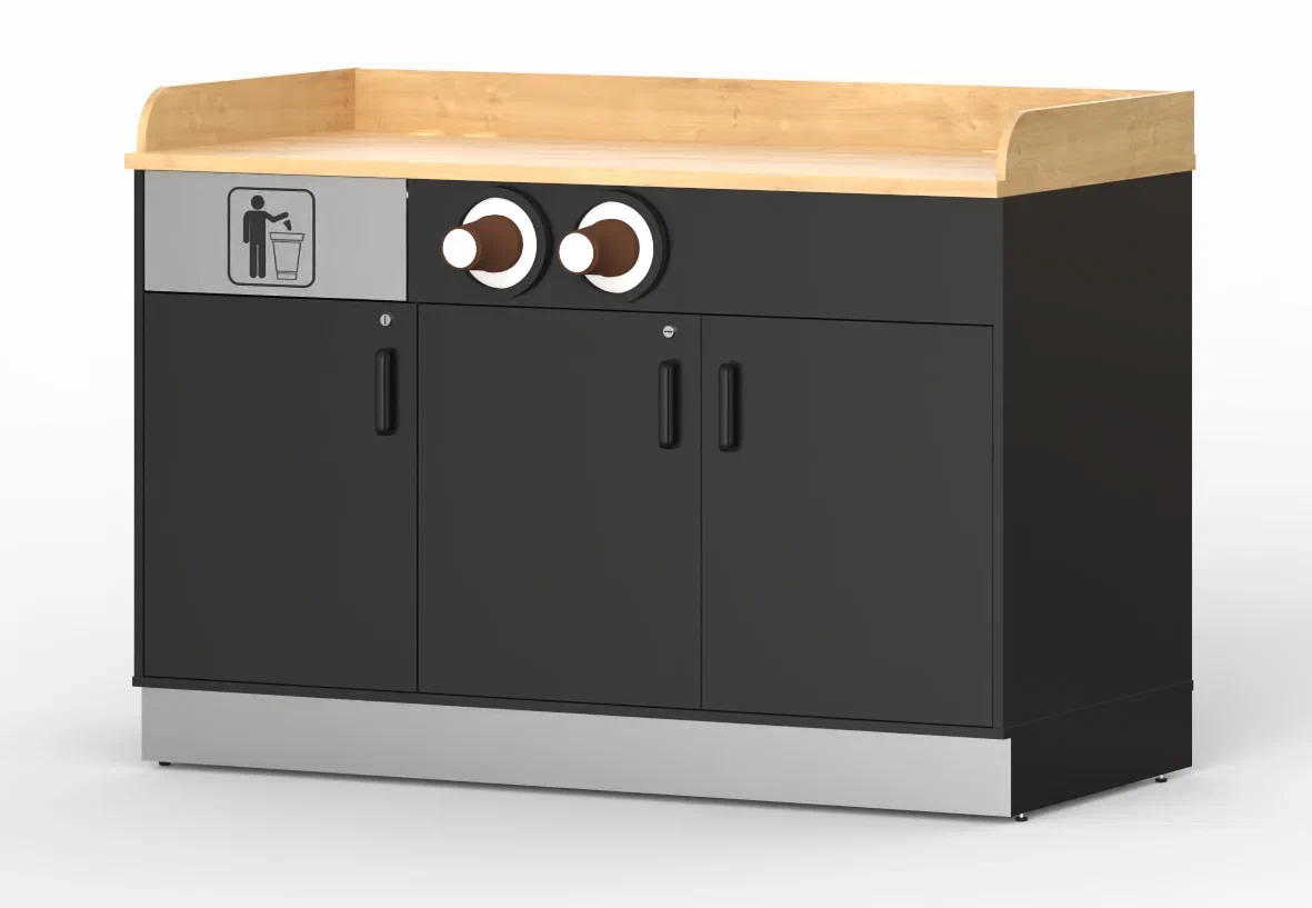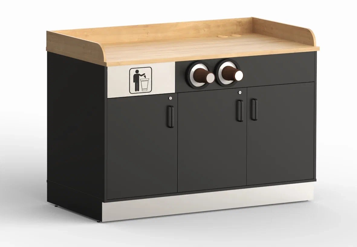 - Места для размещения 2-х стандартных бутылей 19 л для подачи воды и слива, мусорного ведра, товарного запаса
