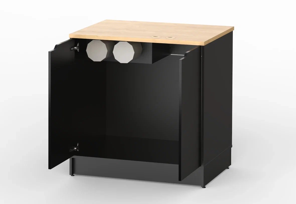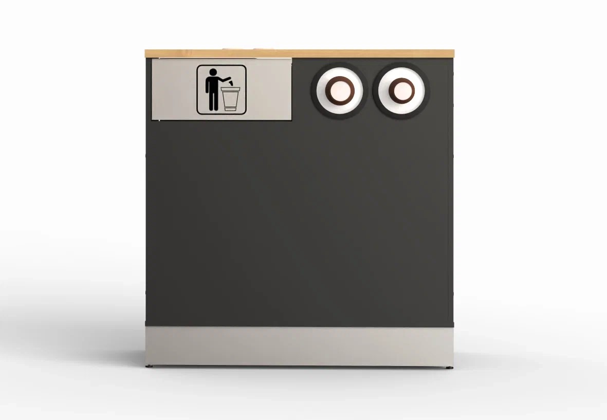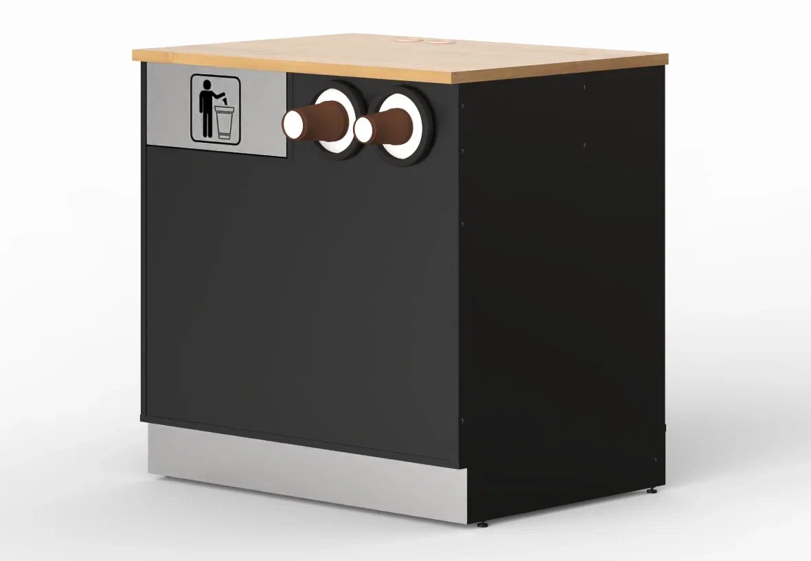 - Отверстия в столешнице с декоративными заглушками для подвода/вывода воды к кофемашине и вывода проводов для подключения техники к сети