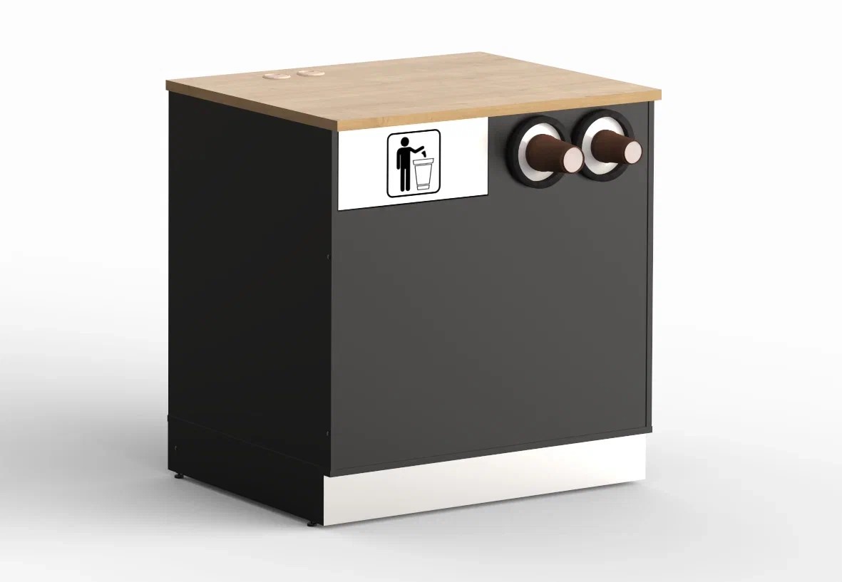 - Места для размещения 2-х стандартных бутылей 19 л для подачи воды и слива, мусорного ведра, товарного запаса