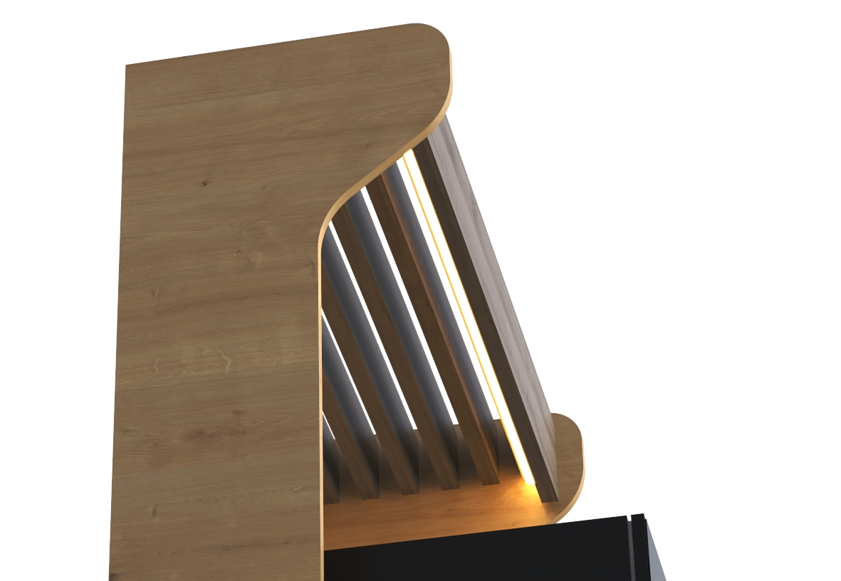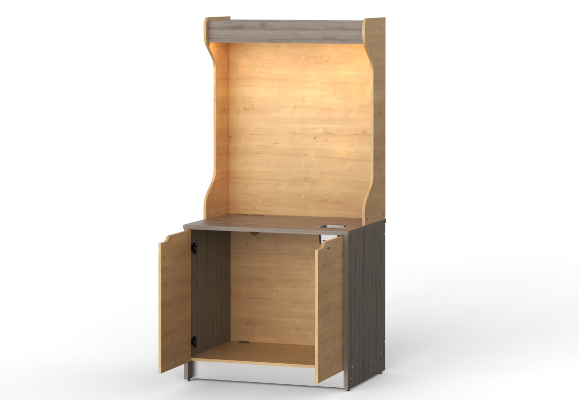 - Отверстия в столешнице с декоративными заглушками для подвода/вывода воды к кофемашине и вывода проводов для подключения техники к сети