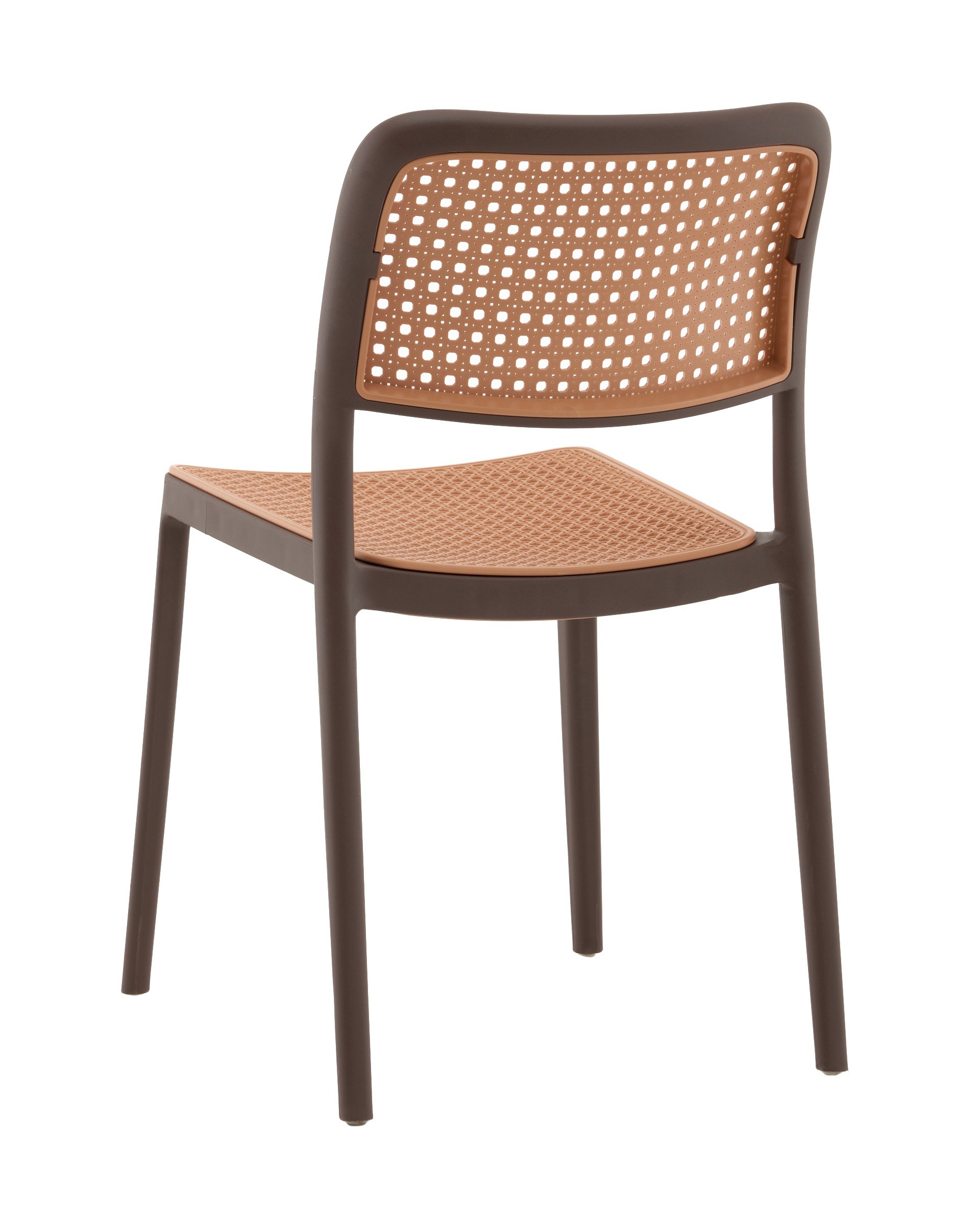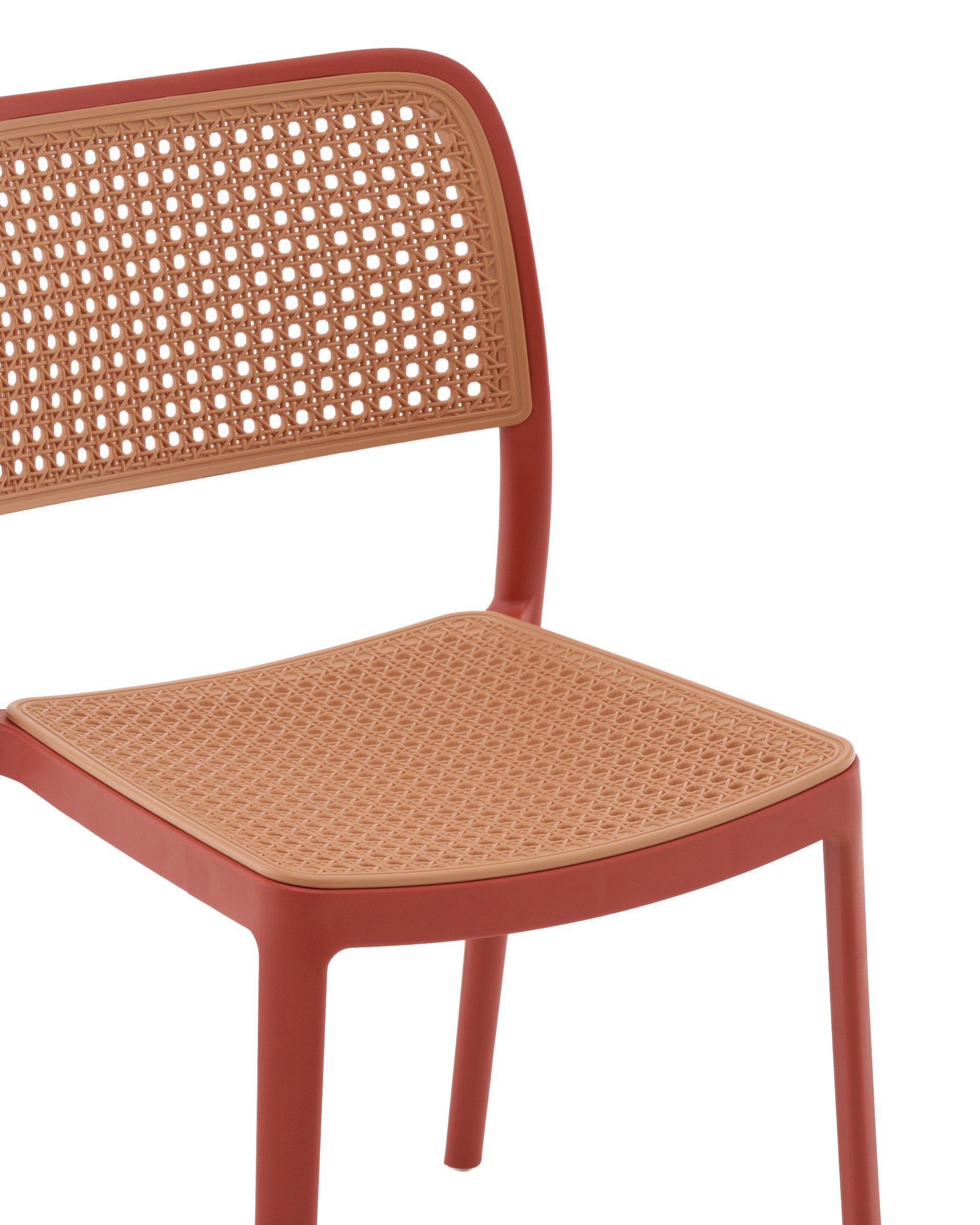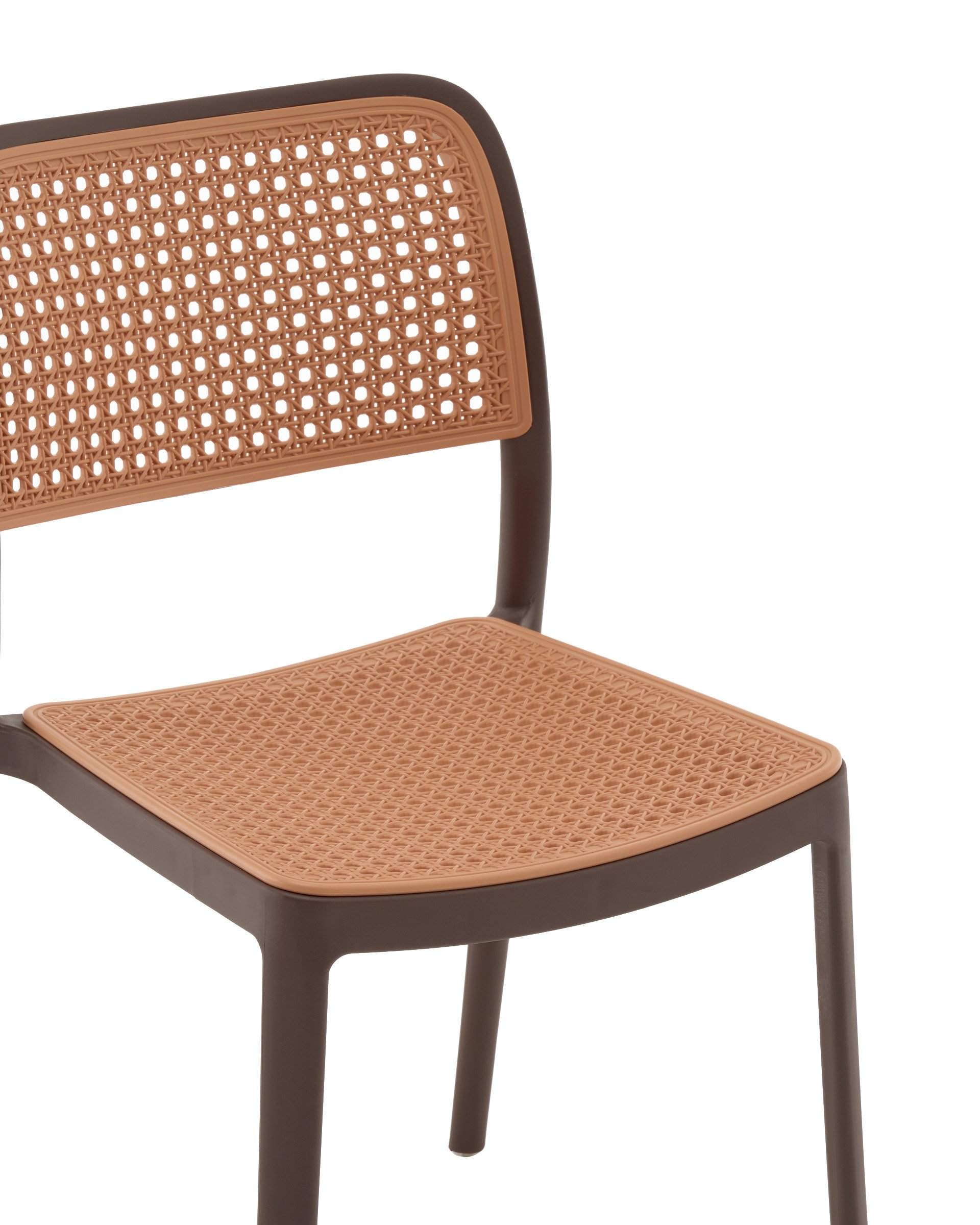 - Плетёный эффект на сиденье и спинке в бежевом цвете напоминает классическую ротанговую мебель, но выполнен полностью из прочного пластика.